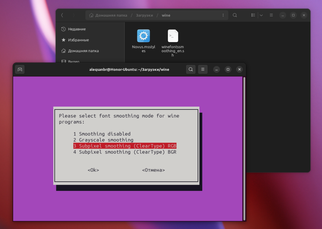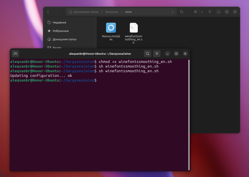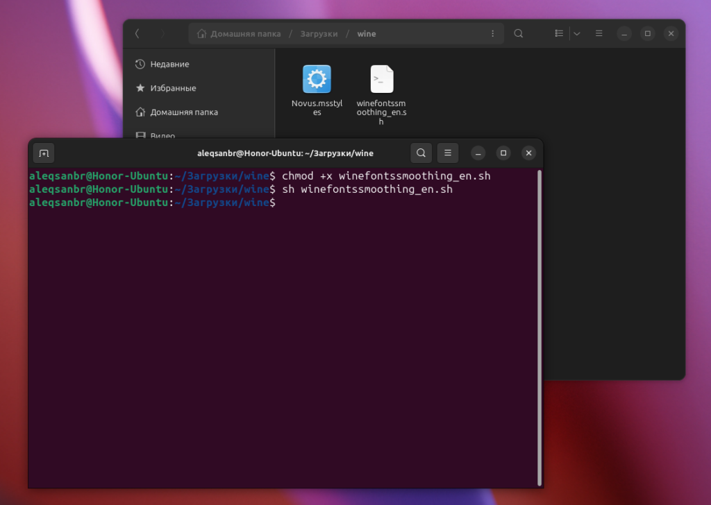 Далее нам нужно запустить скрипт winefontssmoothing_en.sh. Но прежде нужно сделать его исполняемым: