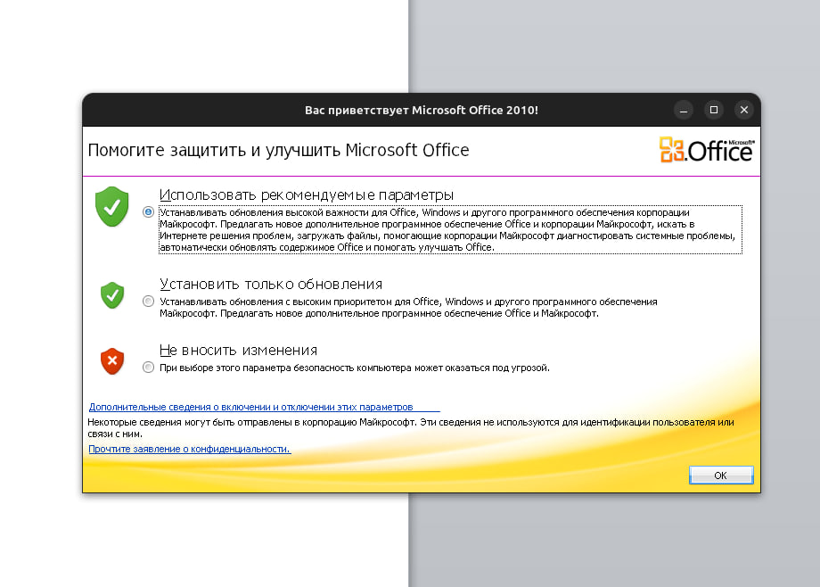 - При первом запуске Office обычно выводит окно с предложением выбрать режим установки обновлений. В нашем же случае этот процесс часто сопровождается зависанием. Можно подождать, но возможно будет необходимо «убить» процесс Wine и Office, например, через htop в терминале или другой диспетчер процессов. Затем снова запустить. Если повезет — даже заработает. Ошибка будет происходить, пока не появится это окно: