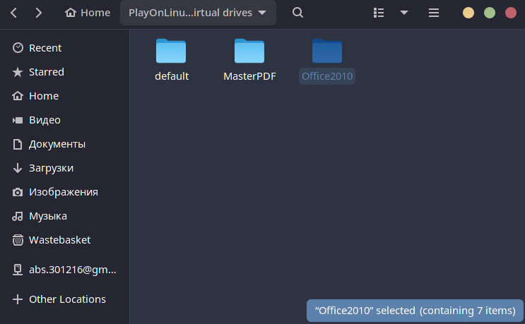 Теперь, если вы устанавливали MS Office через PlayOnLinux, место установки можно найти в папке PlayOnLinux’s virtual drives, которая находится в /home. В этой папке хранятся виртуальные диски PlayOnLinux, найдите соответствующий (у меня это Office2010).